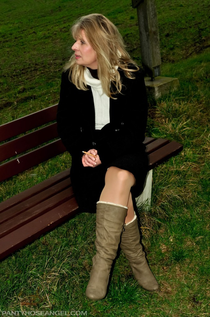 Angel On A Bench In Her Suntan Pantyhose With No Panties Under Them