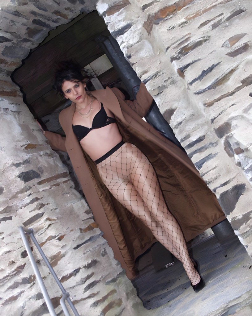 Brunette woman Eve wearing fishnets over shiny seamless pantyhose, opens her coat outdoors by an old castle