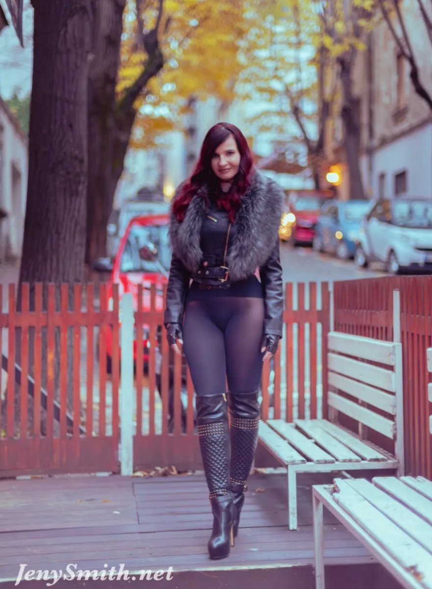 Jeny poses on a city street wearing just a stylish jacket, black seamless pantyhose and tall boots, her feminine curves and private areas fully on display