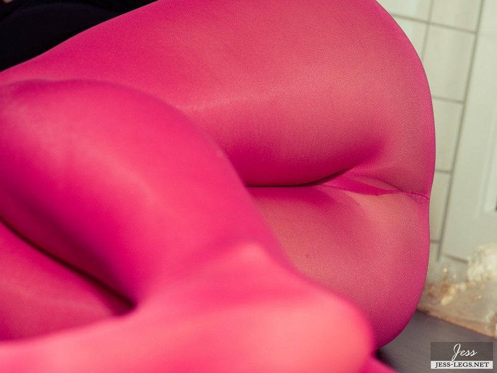 Housewife MILF Jess in pink pantyhose on the kitchen table spreads her legs