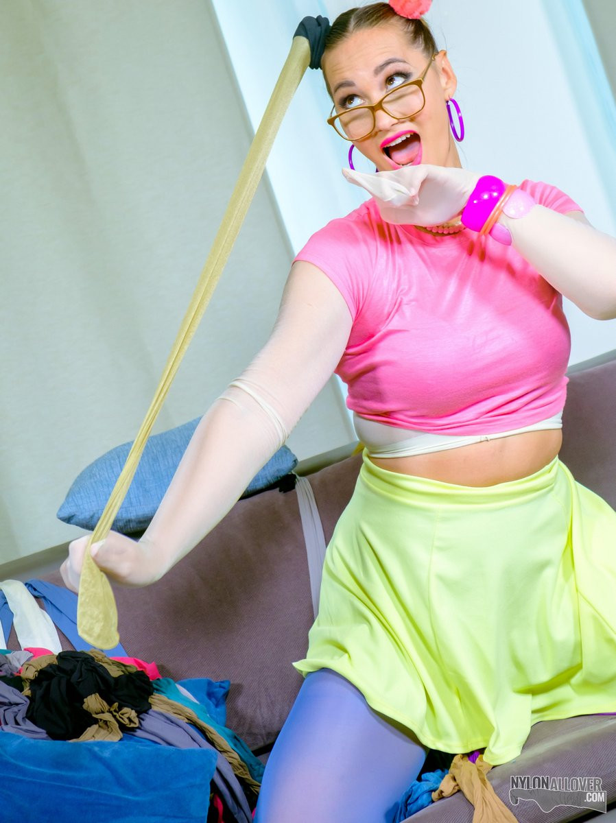 Naomi plays with a lots of colored pantyhose while putting them on herself