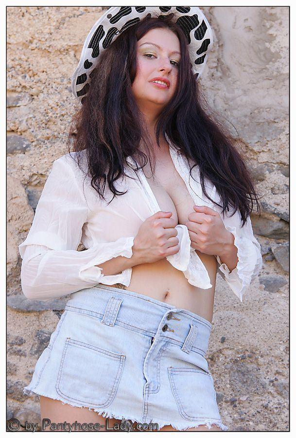Busty lady Paulina in sheer tan pantyhose lifts up her skirt outdoors