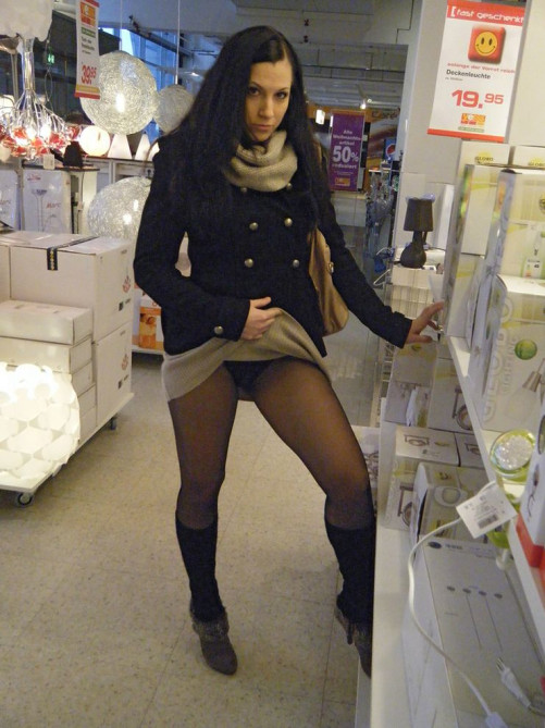 Sultry amateur babe lifts up her skirt to show her legs and bum in black pantyhose in the supermarket