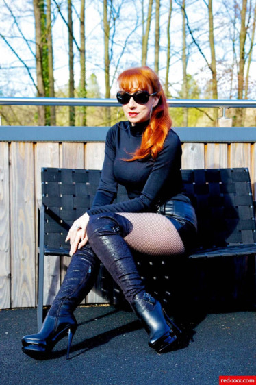 Red haired MILF in fishnet pantyhose strokes her pussy on the roof