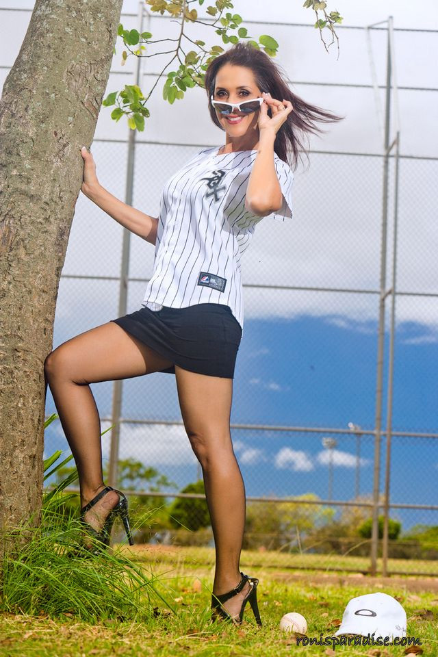 Baseball fan Roni on the pitch wears sheer pantyhose