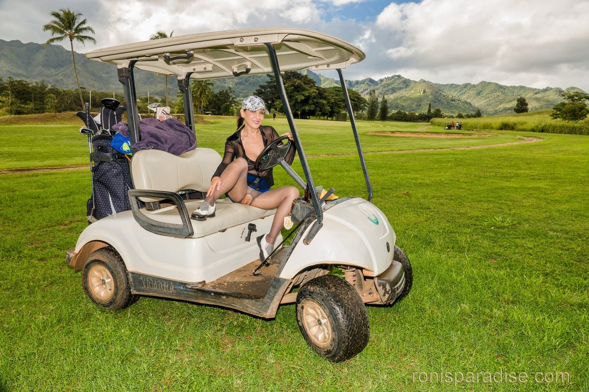 Mature beauty Roni came by golf-cart to play golf in crotchless grey pantyhose and see-through blouse