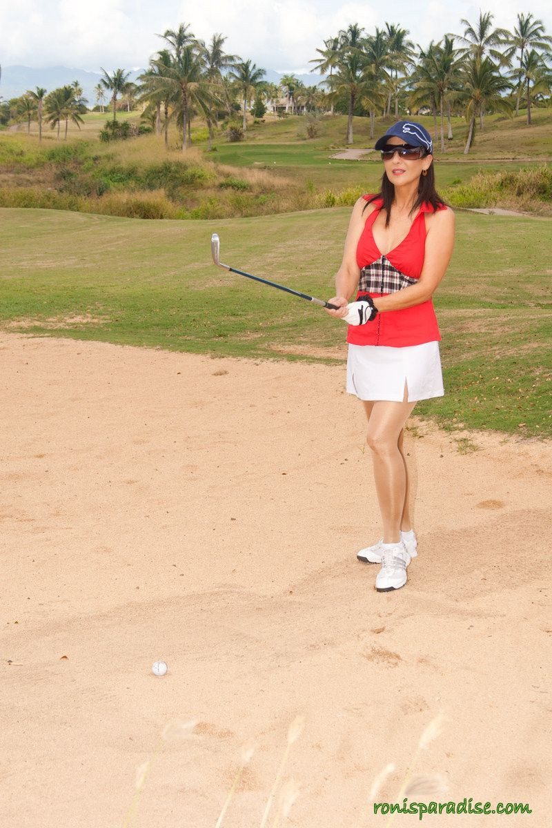 Gorgeous mature lady Roni nuts about golf she is love a game in shiny pantyhose outdoor