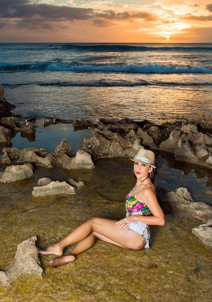 Stunning sunset on sea rocky shore with gorgeous mature lady Roni in wet pantyhose