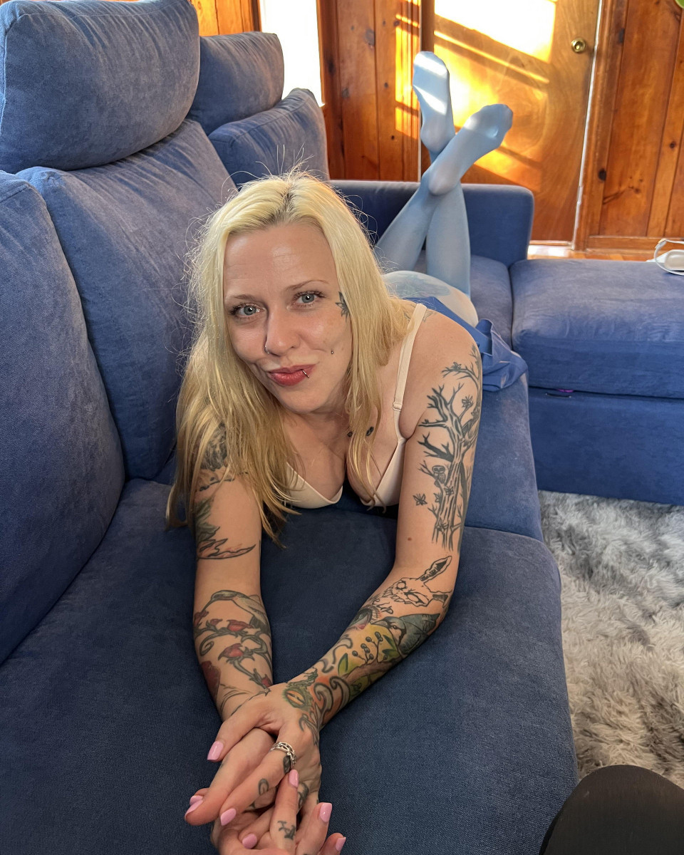 Tattoed blonde in blue seamless pantyhose without pantyes on amateur photos