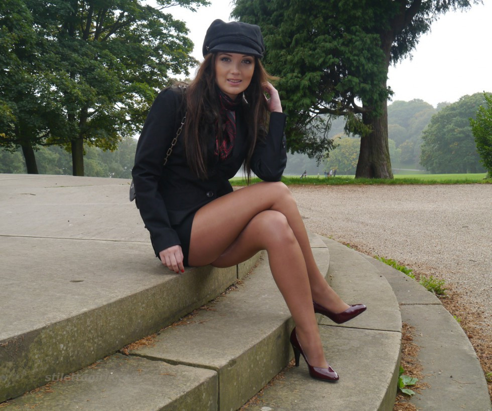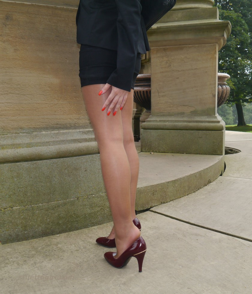 Girl in showing off her sexy legs in barely visible pantyhose and stiletto heels outdoors