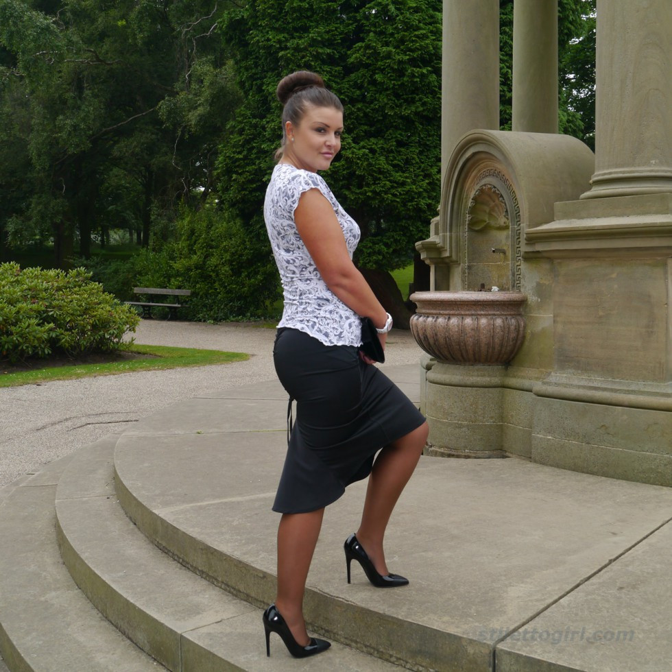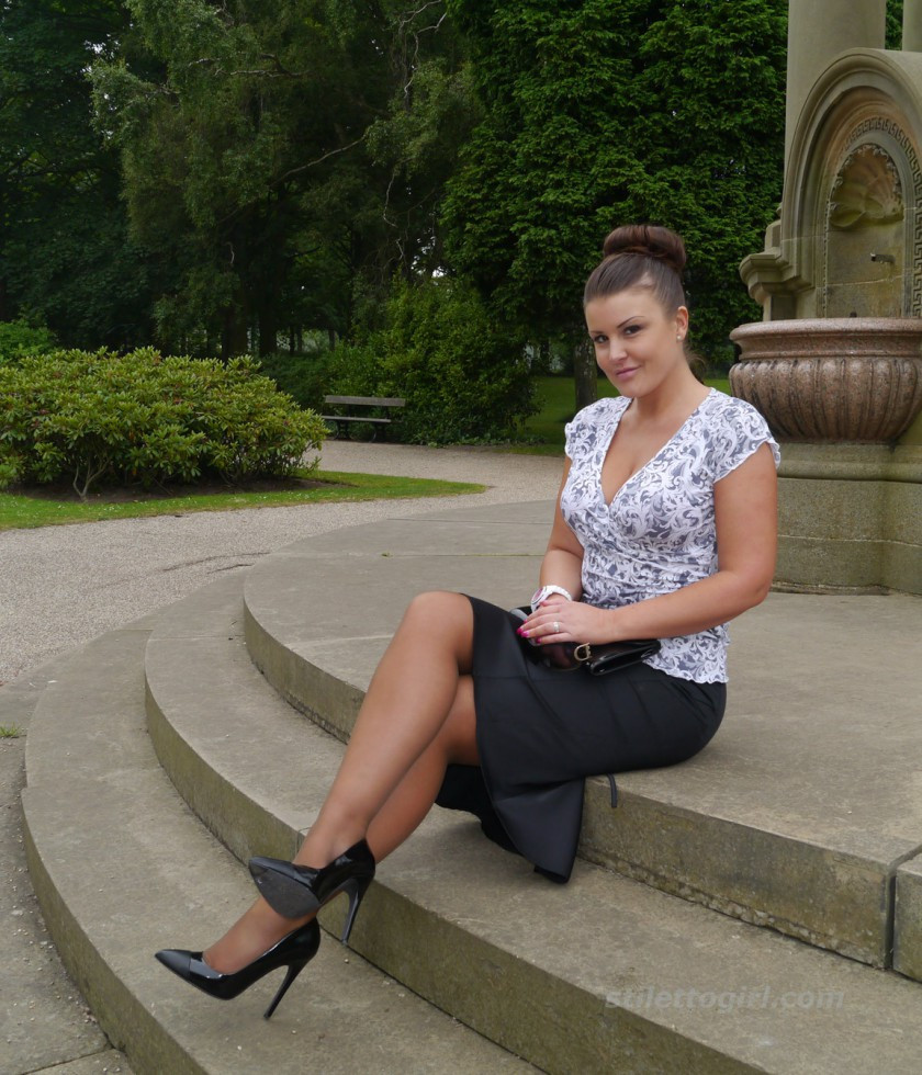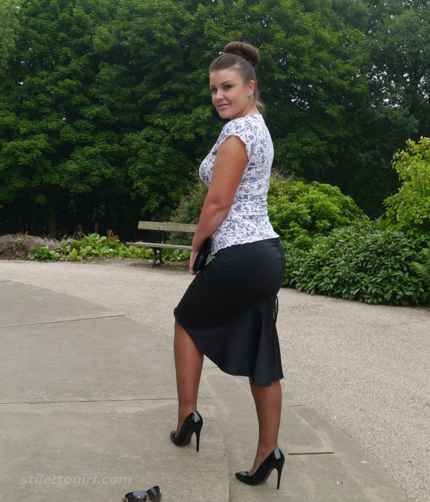 MILF Karen rposes outdoors and shows her legs in a silky nylons and a tall shiny pair of black high heeled shoes