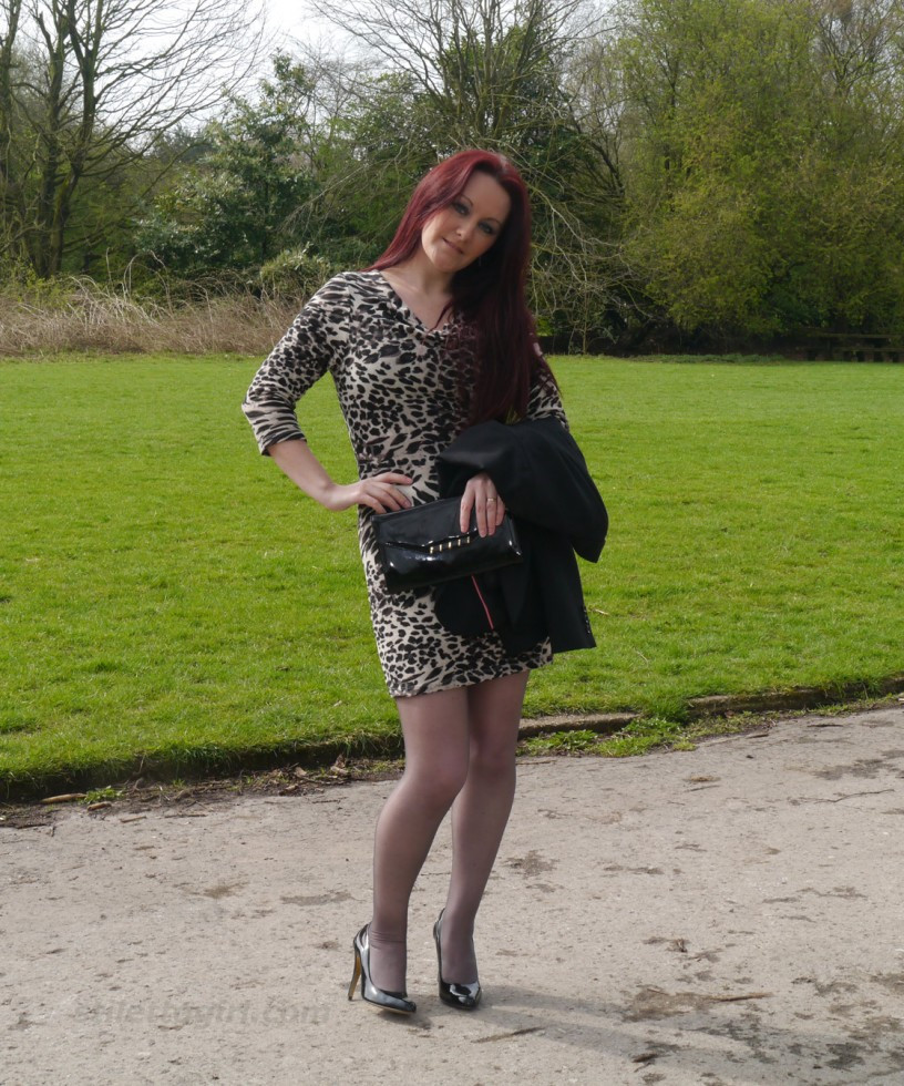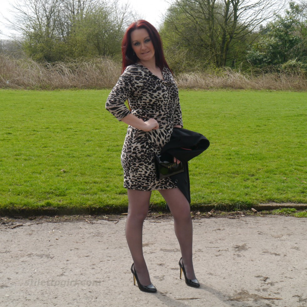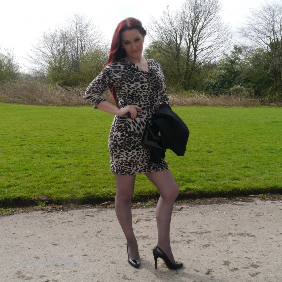 Redhead girl wearing leopard dress, grey pantyhose and high heels poses outdoors